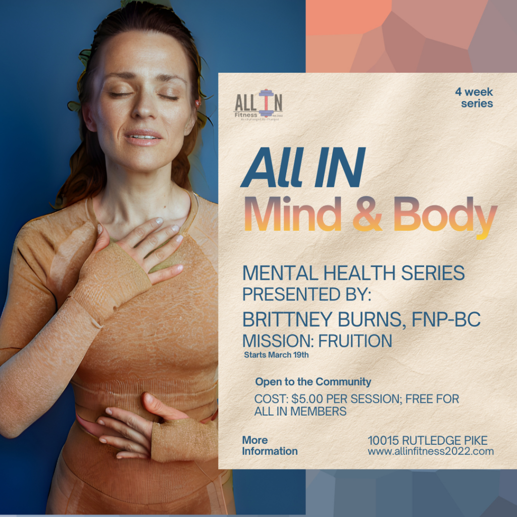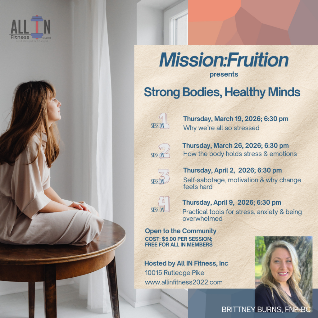 We’re excited to be partner with Brittney Burns, FNP BC of Mission:Fruition. Brittney will be presenting a series starting March 19 2026 focusing on mental health, stress, and tools to help us manage these issues. All IN Fitness is committed to providing wellness not just to it’s clients but helping the community. Each session is $5.00 for the people who are not ALL IN members. Free for members.